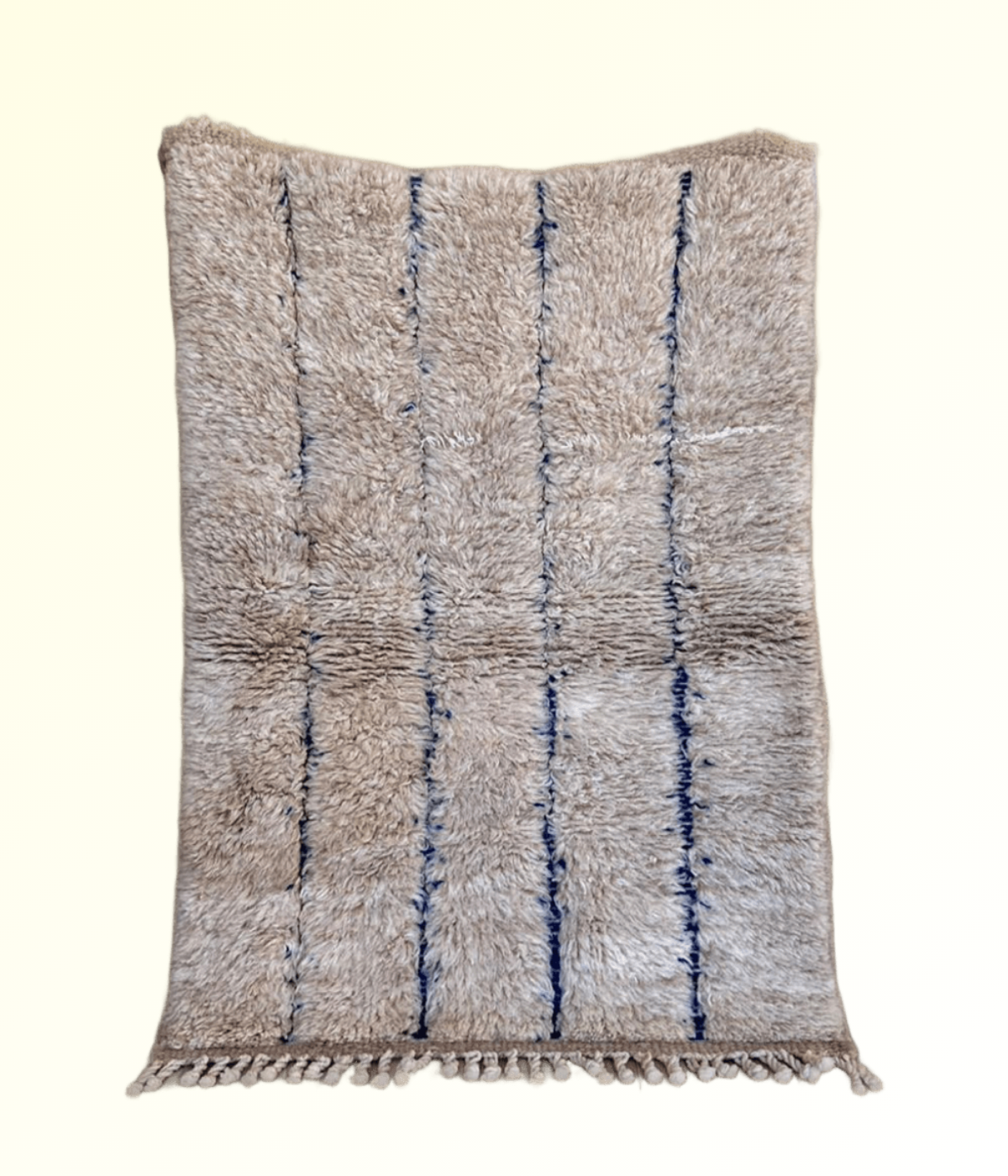 This piece features a refined ivory cream base with subtle deep blue linear patterns, creating a minimalist and timeless aesthetic. Its clean design makes it perfect for modern interiors, while preserving the authenticity of traditional Moroccan craftsmanship.